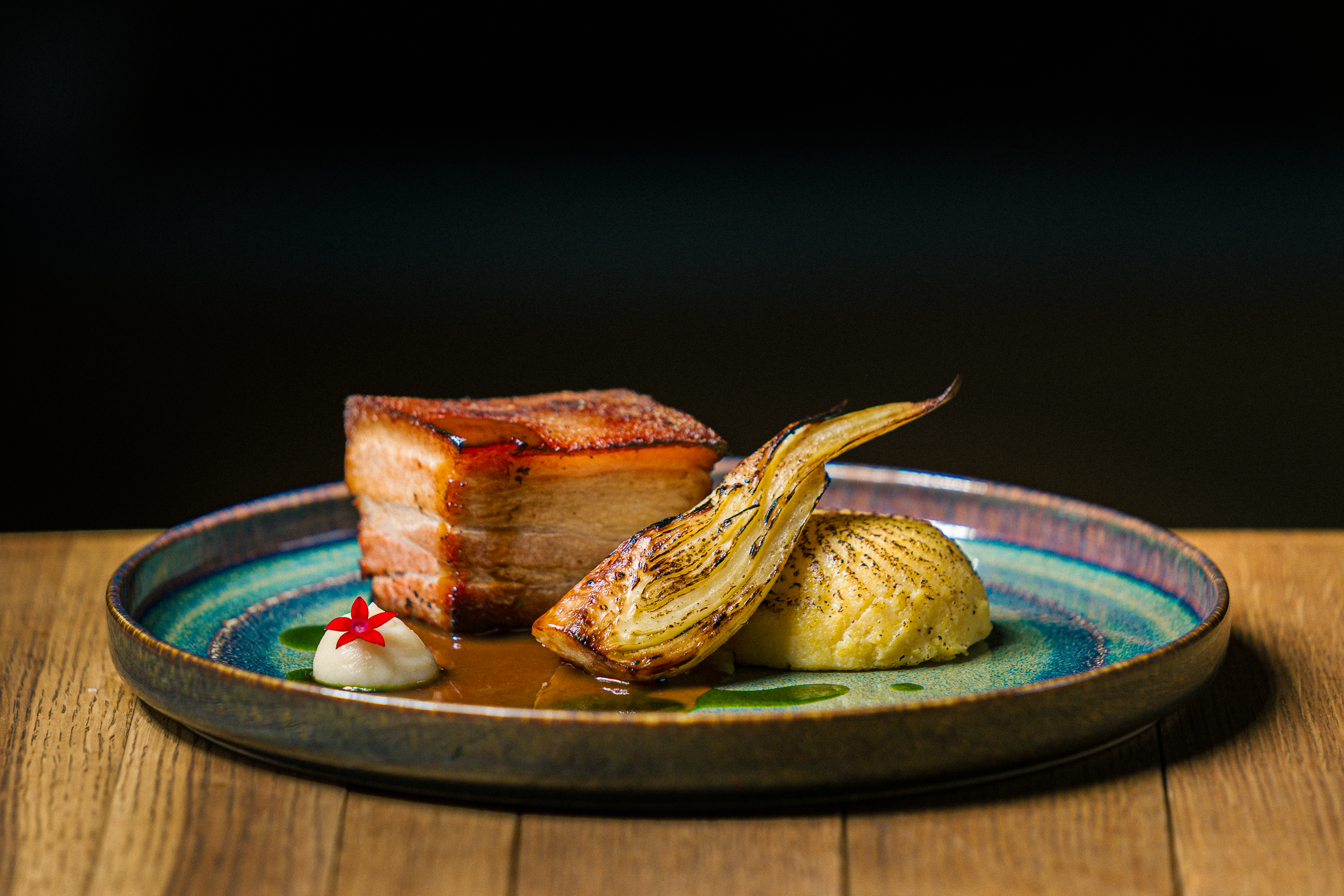Malaccsászár, grillezett édeskömény, zellerpüré, rebarbara, jus