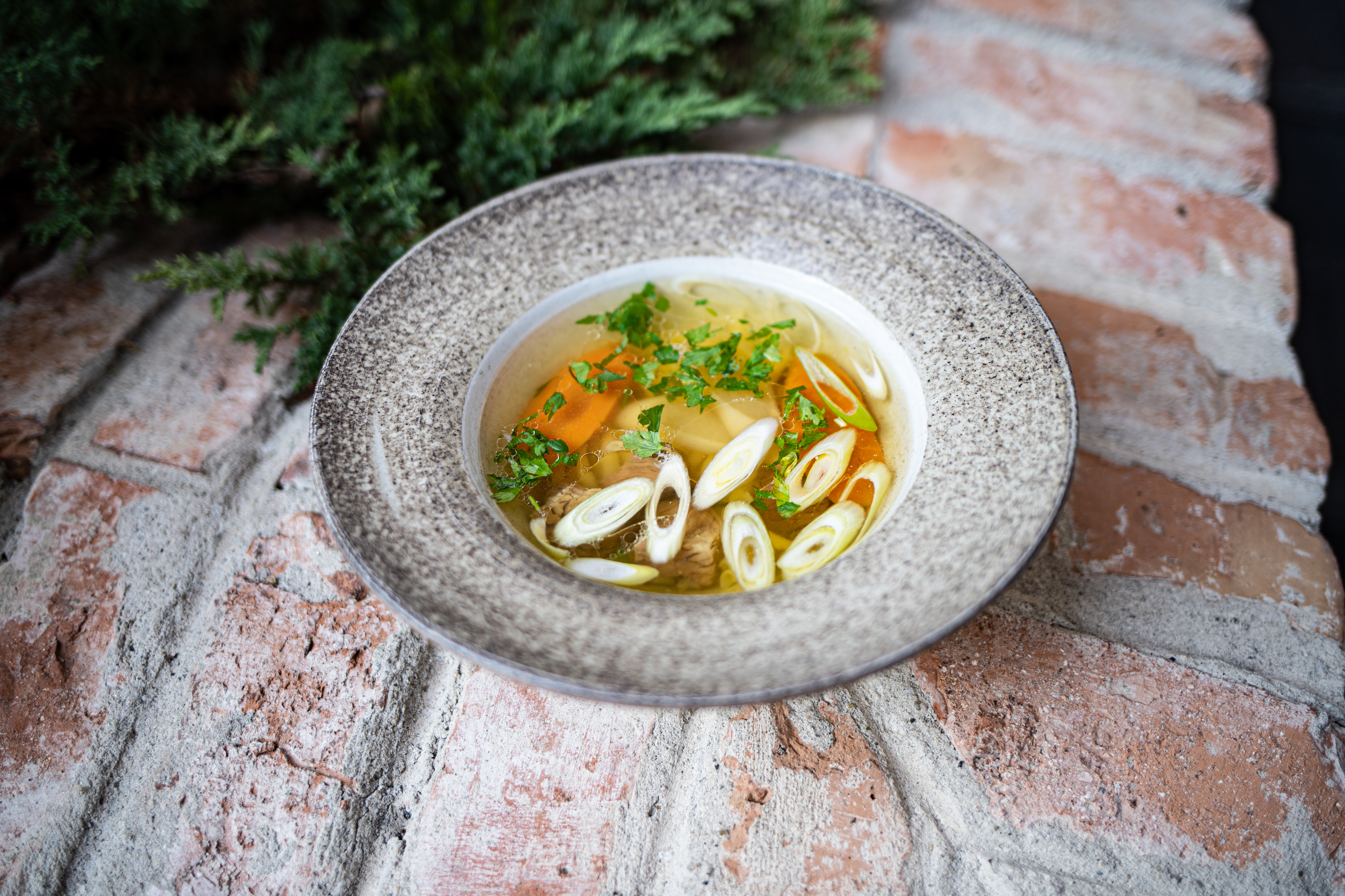 Tyúkhúsleves, főtt hús, cérnametélt, szezonális zöldségek